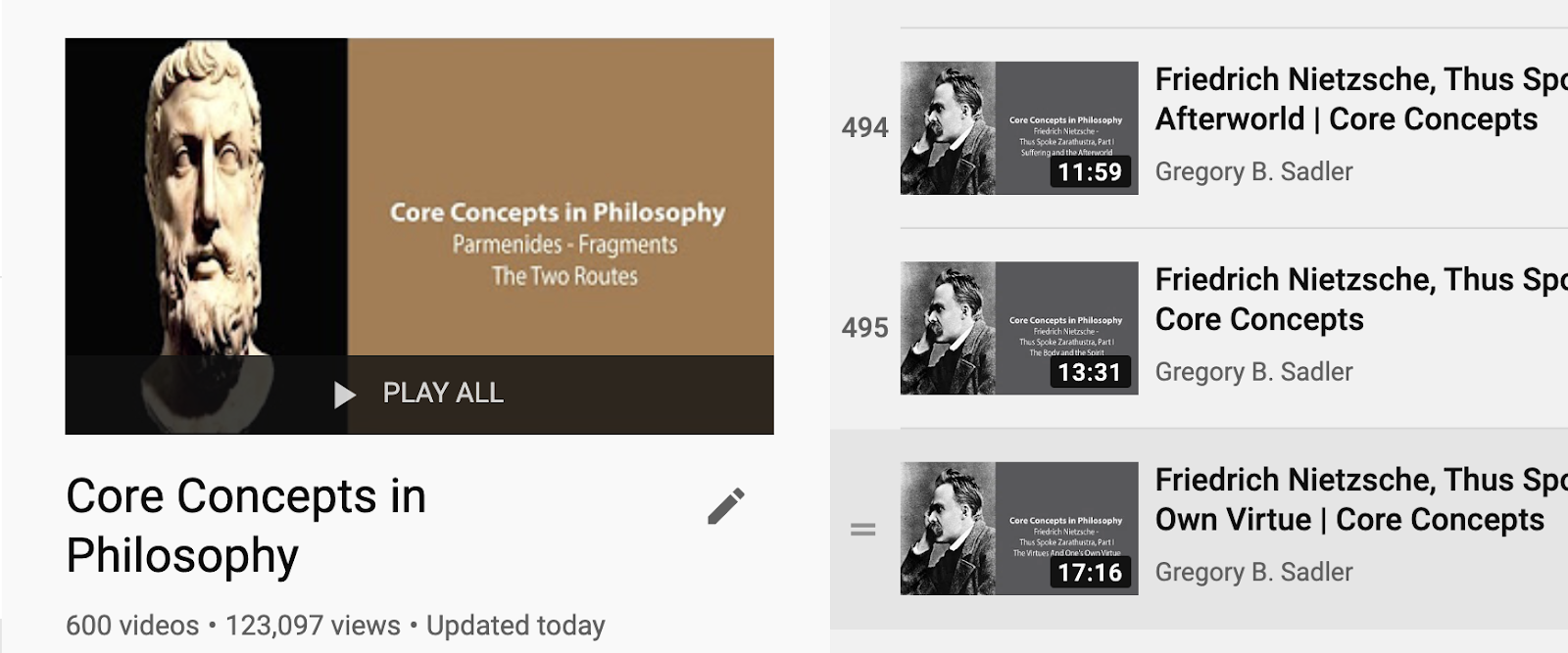 My selection of what texts and thinkers to focus upon for the core concept videos has been driven primarily by the needs of my classes. Each semester I try to add some new content, and - provided I actually have the time - I'll create new videos on that new material. Sometimes that leads to a lot of videos, enough to cover entire works like Aristotle's Nicomachean Ethics, Rene Descartes' Meditations, or Immanuel Kant's Groundwork for the Metaphysics of Morals